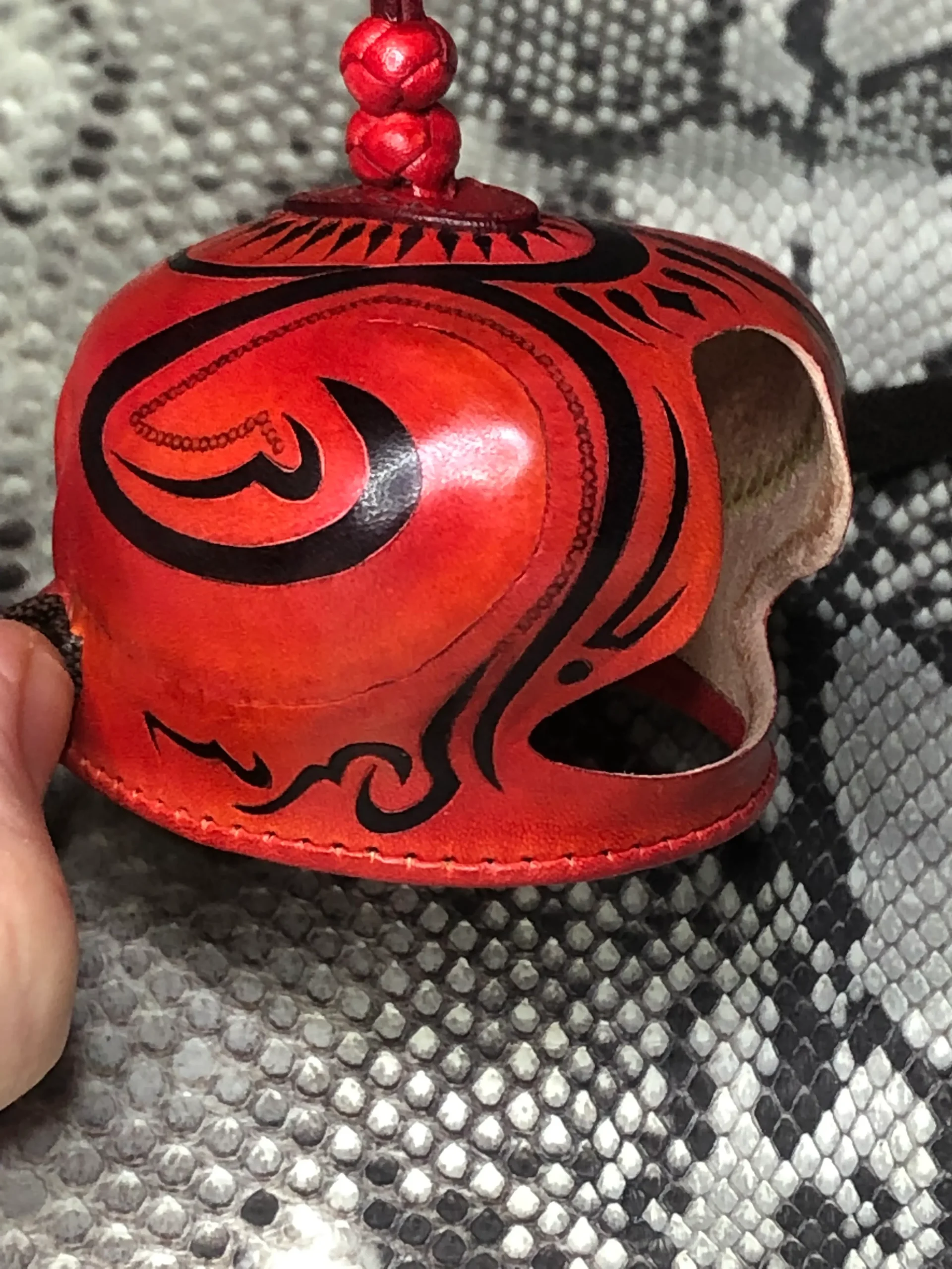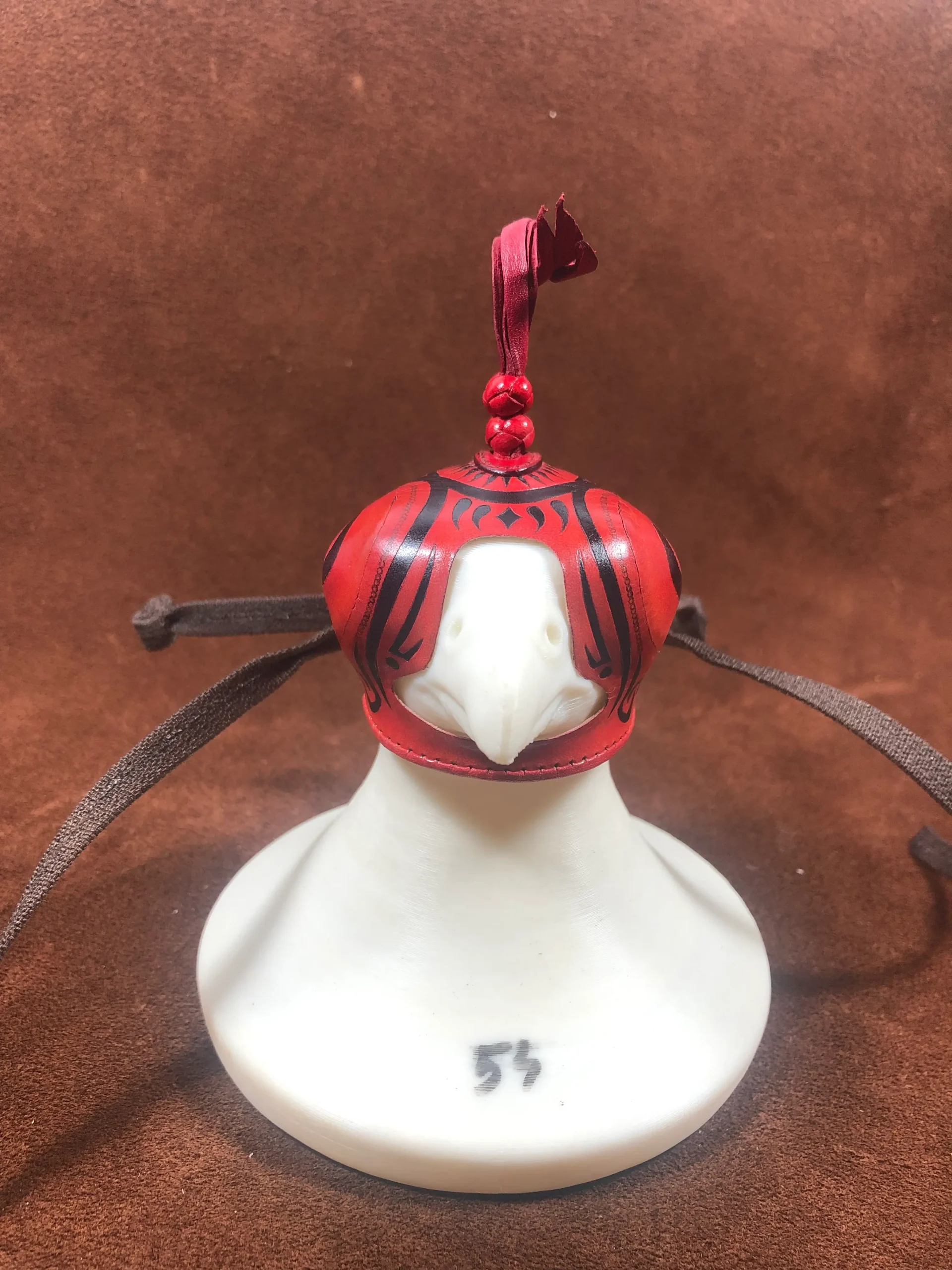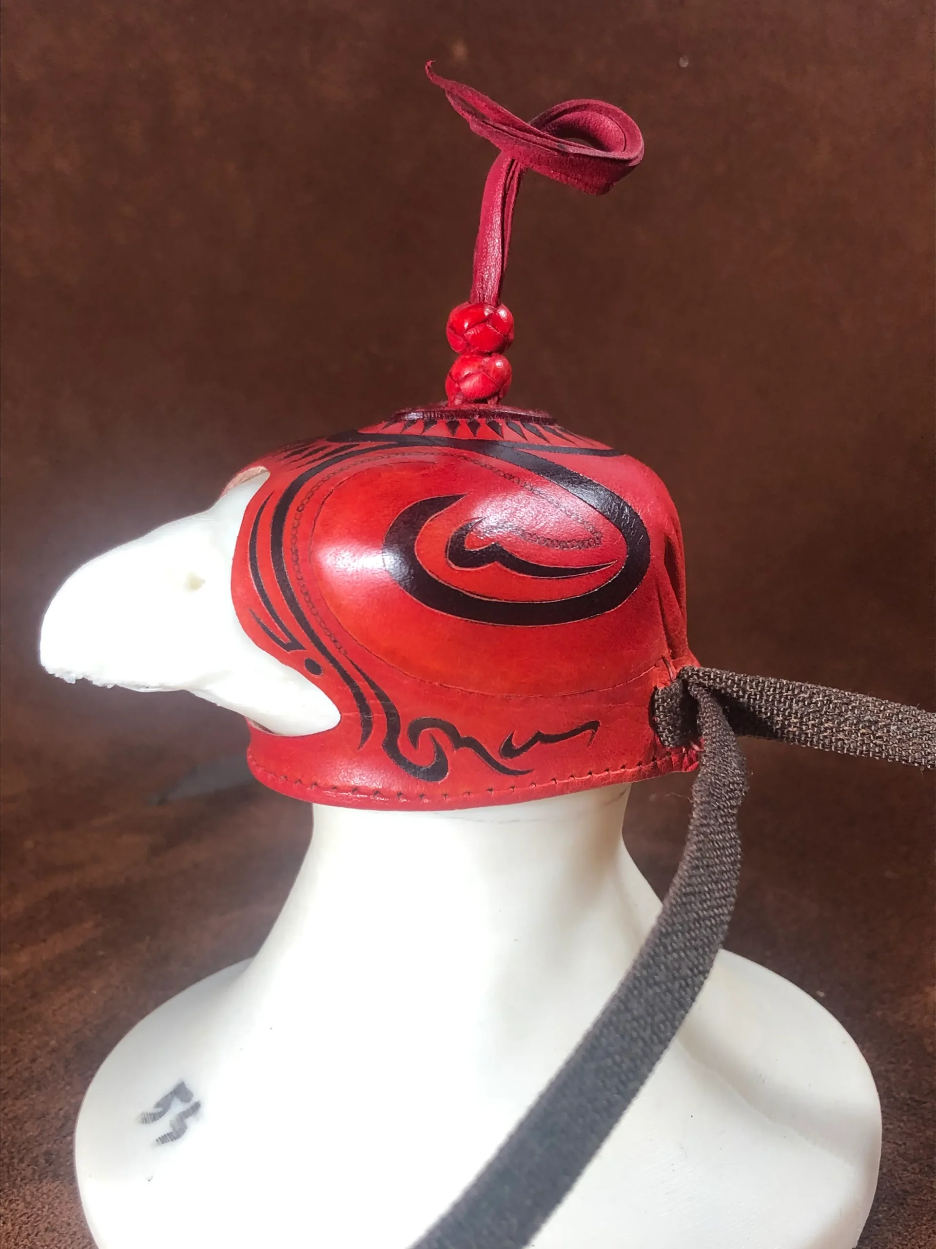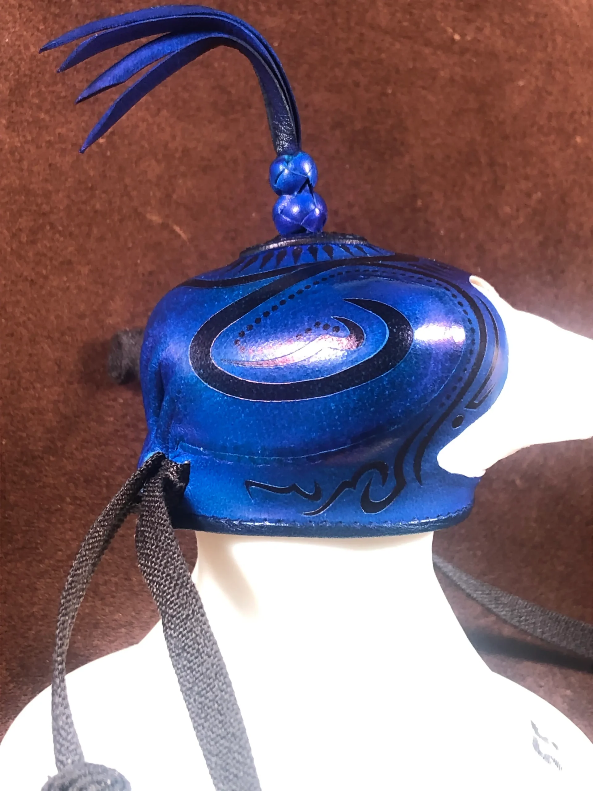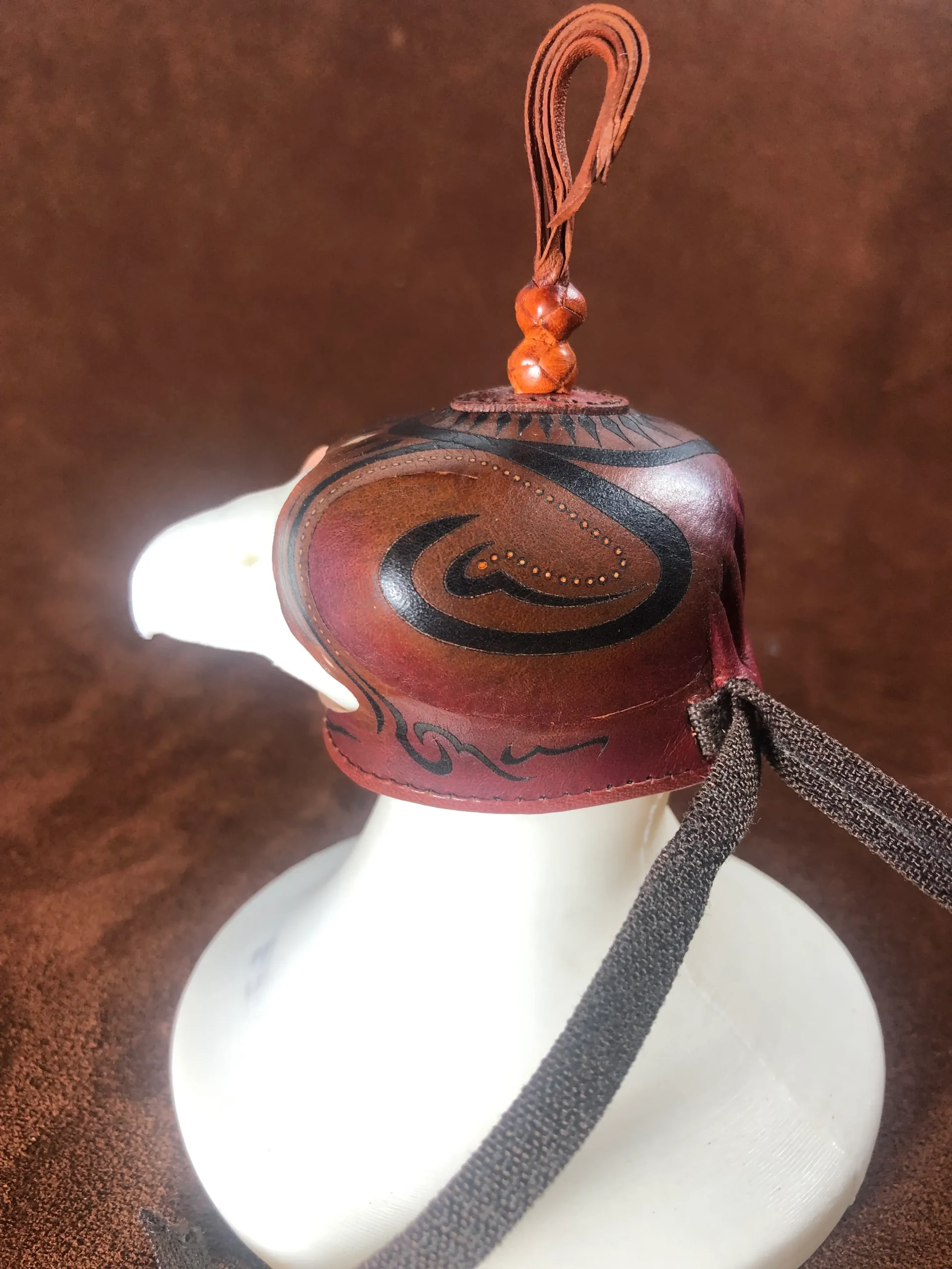 Caperuza árabe realizada en color a elegir o color natural. La caperuza tiene adornos geométricos al estilo hispano-musulmán realizados a cuchillo y posteriormente pintados a mano con tinte negro. El collarín puede realizarse en el mismo color que la caperuza o en negro. La caperuza está coronada por dos nudos turcos que salen de una tapa cosida que le confiere a la caperuza un toque distinguido y elegante.