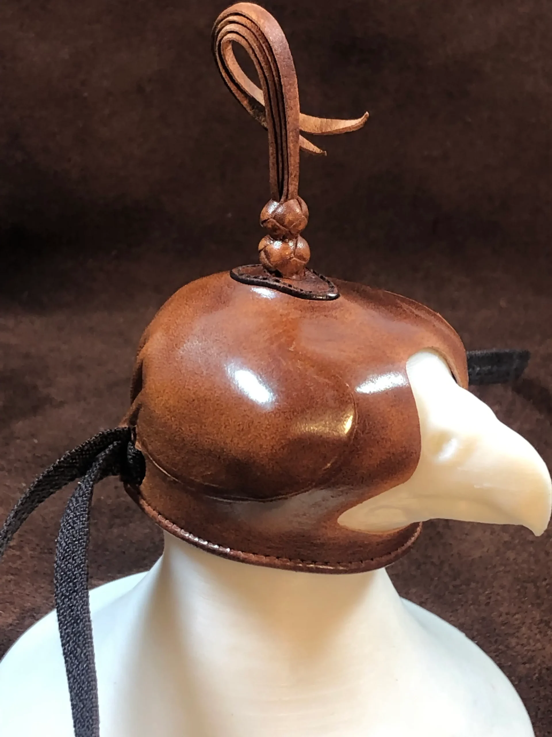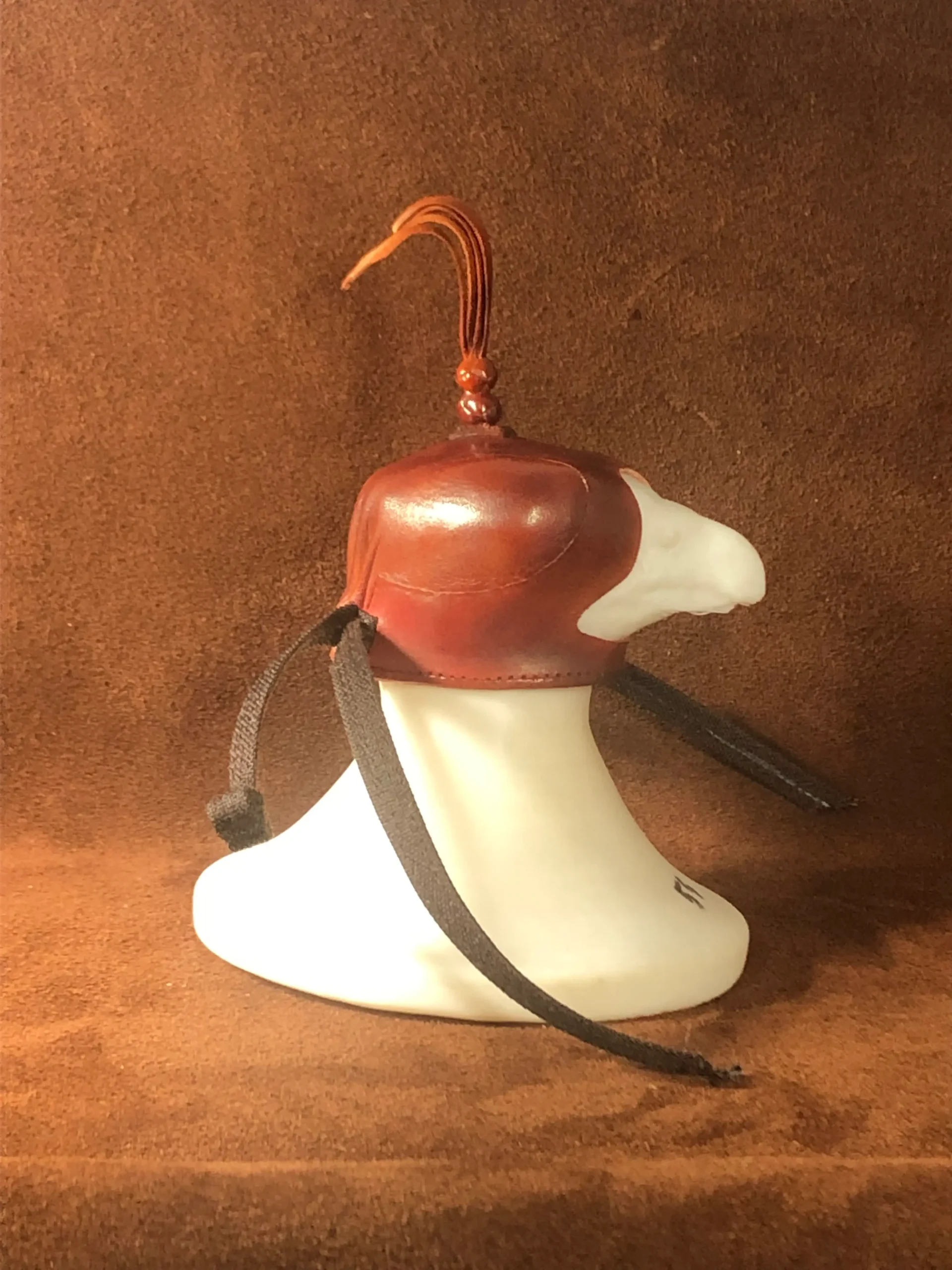 Uno de mis patrones favoritos. Muy cómoda para el pájaro y tradicionalmente muy usada en mi país. Cosida a media Carne y trabajada en molde, se adapta muy bien a la cabeza del pájaro. El cierre del fuelle hace que el funcionamiento de los cerraderos sea bastante duradero. El cuerpo de la caperuza es de piel de ternera y está coronada por dos nudos turcos con una pieza interior que impide que el nudo oscile con el paso del tiempo.
